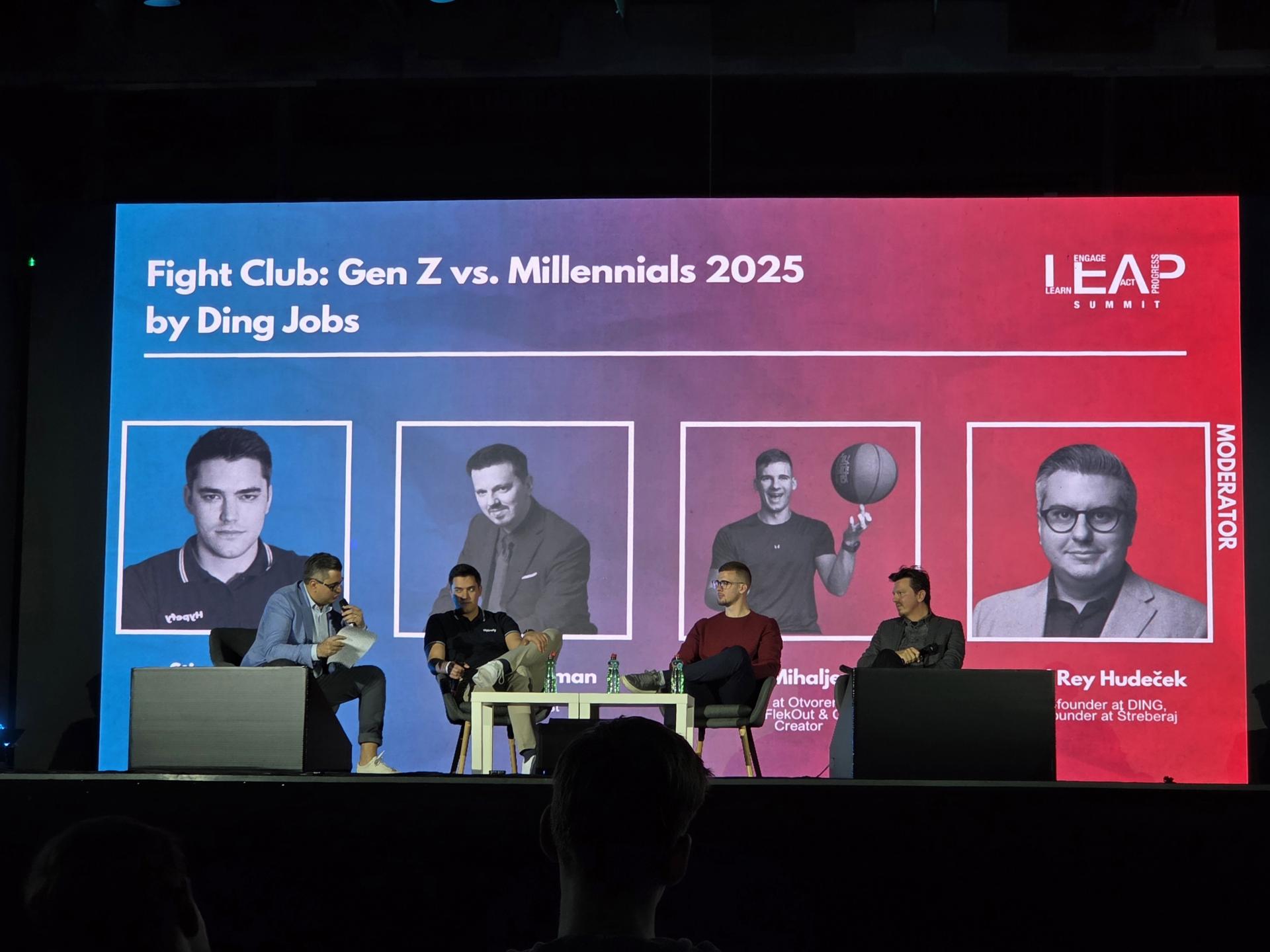 Nakon uvoda u drugi dan konferencije na pozornicu su pozvana četiri člana prvog panela nazvanog "Fight Club: Gen Z vs. Millennials 2025". Moderator rasprave bio je David Rey Hudeček. U taboru milenijalaca našao se direktor start upa Stjepan Zelić, a generaciju Z došao je braniti influencer s Otvorenog Radija Jan Mihaljević. Četvrti gost bio je psiholog Matej Sakoman koji je bio zadužen da debati ponudi i stručnu podlogu.